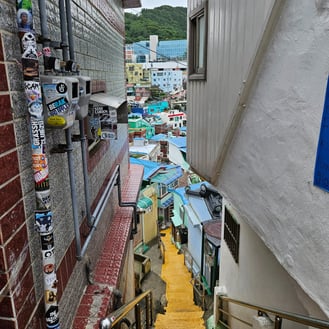 Gamcheon Village, Busan, South Korea, was one of the last places of refuge during the Korean war. It is a village that has little planned structure aside from the fact that it is on the hillside of Gamcheong-Dong. Fleeing from the Korean War, refugees built makeshift homes creating a patchwork haven on the edge of Busan. In 2009, Busan City Government began to develop the area into an artistic centre and tourist phenomenon where “life, arts, and culture co-exist”. They used colour and art installations to mask the age of the buildings and create a tourist hotspot popular on social media for its multitude of photo spots.